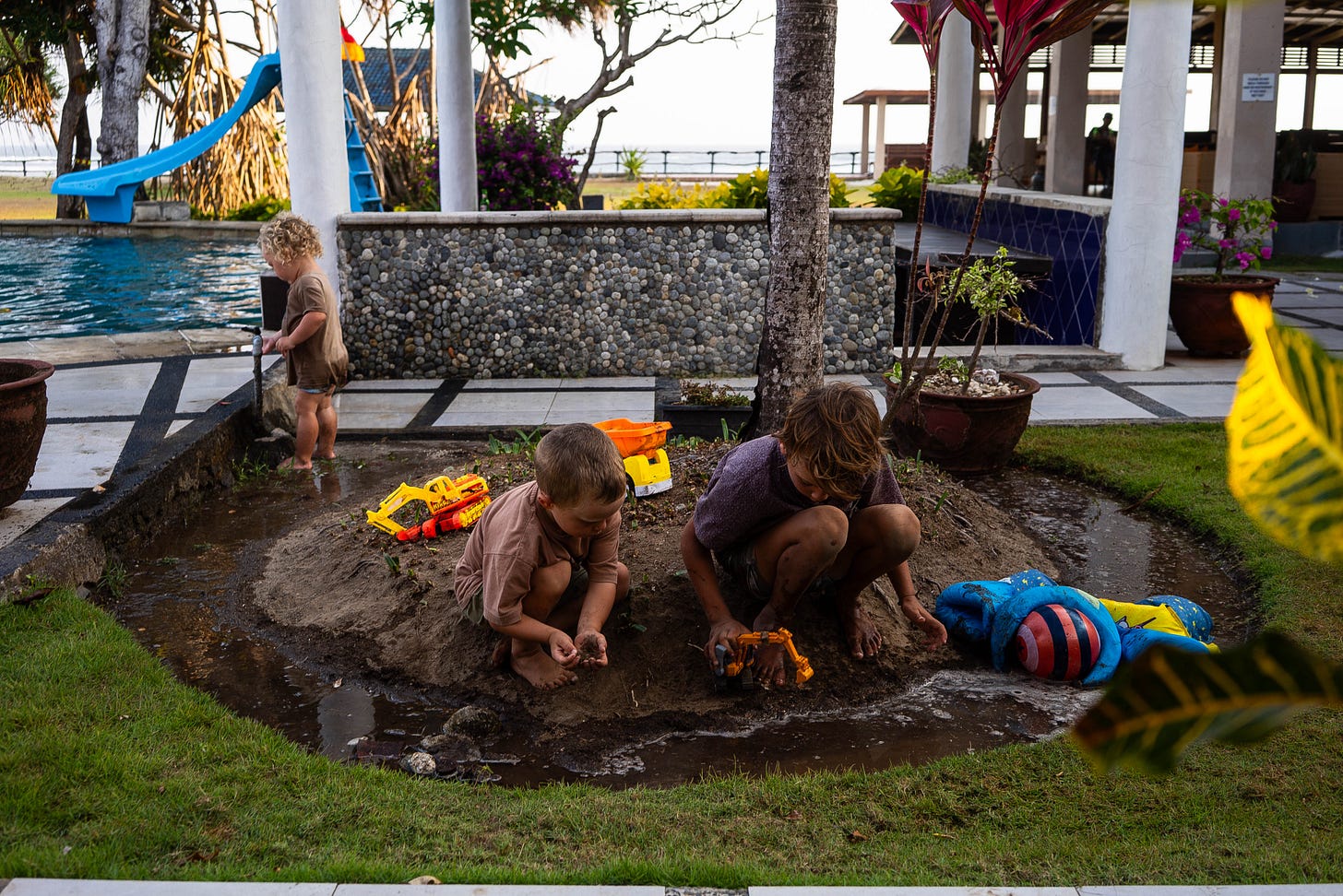 When we first brought the boys to Lombok a year ago for a holiday my first few days were filled with a slight panic of what to do with them. The house was all sharp corners and slippery concrete, and the yard was an ungated pool with a few too many mosquitos. We had hardly brought any toys and I was going a little insane. Then one morning I had the urge to explore and walked down the little lane our villa came off. There I made the wonderful discovery that the end of the lane was blocked off to traffic and there was a small dirt road full of muddy puddles. So in haste, I pulled out some big spoons from the cupboard, grabbed the little diggers I had packed from home and led them up the lane. They spent the next hour deep in play, Sylver digging, splashing and exploring the texture of stones with his mouth! And Sonny creating ‘worksites’ and ‘working very hard’. It was bliss. I joined them at first and then slowly backed away to leave them to their play.